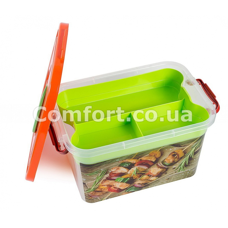 Емкость комплектуется крышкой с ручкой, которая плотно закрывается и дополнительно фиксируется ручками контейнера с двух сторон, это препятствует случайному открытию крышки. Также бокс комплектуется вкладышем прямоугольной формы, который имеет четыре ячейки разного размера, в которых очень удобно хранить мелкие предметы. Прозрачные стенки судочка позволяют просматривать содержимое в нем. Контейнер универсальный имеет неограниченную сферу применения в быту и термин эксплуатации.