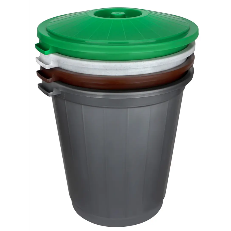 Бак с крышкой, необходим в домашнем хозяйстве, можно использовать для хранения воды, сыпучих продуктов, мусора или белья, изготовлен из цветной пластмассы.