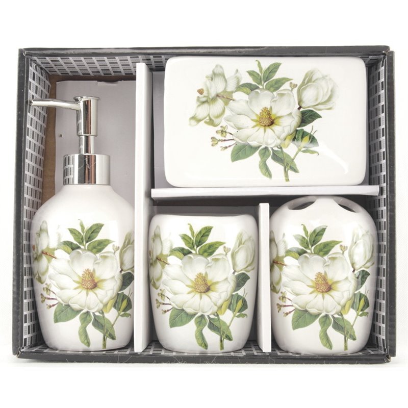 Набор для ванной комнаты включает в себя дозатор для жидкого мыла, стакан для зубных щеток, мыльница, стакан. Все аксессуары для ванной комнаты собраны в одном наборе и декорированы нежным рисунком в одном стиле. Набор аксессуаров изготовлен из высококачественной керамики. Данный набор дополнит и украсит дизайн ванной комнаты и станет прекрасным подарком для ценителей красивых вещей для дома!