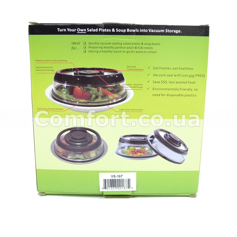 Вакуумная крышка для продуктов с силиконовым ободком практичная и необходимая вещь на каждой кухне, благодаря ей Вам больше не нужно перекладывать еду в судочки и накрывать тарелками или пищевой пленкой. Универсальная вакуумная крышка фиксируется прямо на тарелке за счет клапана, который при открытии вытесняет воздух. Вакуумная крышка прозрачная с цветным ободом, позволяет легко просматривать содержимое, защищает свежесть, вкус и аромат блюд и продуктов. Чтобы снять вакуумную крышку, достаточно просто открыть клапан. Универсальная вакуумная крышка изготовлена из прочного, пищевого силикона, который не впитывает запахи и не имеет своего, стойкий к высоким и низким температурам. Вакуумную крышку можно использовать в микроволновой печи, в холодильнике и морозильной камере, удобно мыть в посудомоечной машине. Яркие цвета вакуумных крышек создадут уют и радостное настроение на Вашей кухни. Размеры: 19х7,5см.