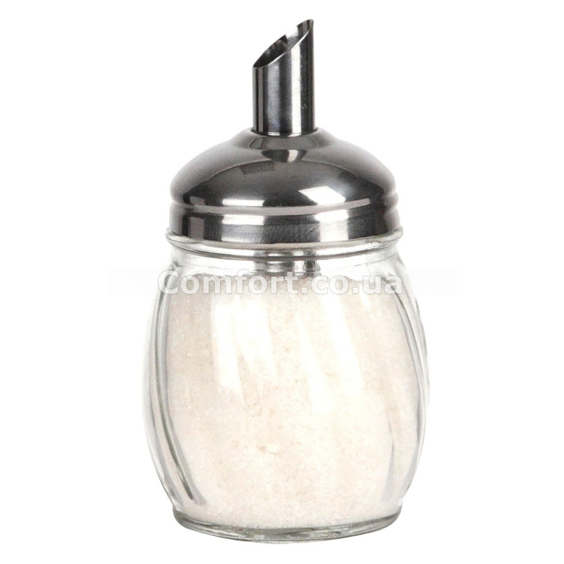 Сахарница с дозатором состоит из стеклянной емкости и металлического дозатора, удобна для использования дома, в кафе или офесе, сахар не просыпается и дозируется равными частями.