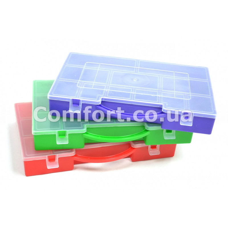 Удобный и экономичный органайзер чемоданчик предназначен для компактного и систематизированного хранения и транспортировки небольших предметов. Таких как: мелкие элементы и детали, метизы, фурнитура, запчасти, рыболовные принадлежности, крепежные элементы, болты, гайки, шурупы, элементы шитья, нитки, бисер, пуговицы. Бокс органайзер изготовлен из прочной, высококачественной, цветной пластмассы, по всей поверхности усилен ребрами жесткости, что делает его крепким, износоустойчивым и надежным. Переносной ящик для хранения легкий и практичный имеет удобную ручку для переноски. Универсальный органайзер с традиционными отсеками позволяет чрезвычайно просто и точно сортировать содержимое контейнера. Прозрачная крышка без открытия позволяет проверить, что находится внутри. Особая форма крышки предотвращает перемещение мелких предметов из одного отделения в другое. Крышка с крепкими защелками предотвращает случайное открытие и не позволяет мелочам разлетаться. Надежные мощные замки не дают рассыпаться содержимому, даже при вертикальной переноске. Вместительный пластмассовый органайзер с перегородками позволяет хранить большое количество различных мелочей и эффективно использовать рабочее пространство, он прослужит Вам долгое время. С этим органайзером чемоданчиком всё необходимое всегда будет у Вас под рукой и на своих местах. Размеры: 28х20х4см. Производитель: Украина.