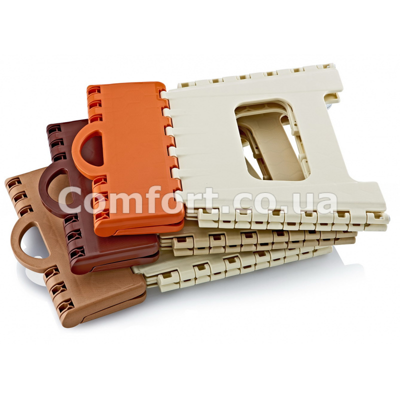 Компактный и удобный пластиковый раскладной табурет легкий и практичный, занимает мало места при хранении, если мебель не используется. Благодаря своей конструкции стул может складываться до компактных габаритов, легко помещается в шкафу, в сумке, в рюкзаке или в багажнике автомобиля. В разложенном состоянии он полностью заменит собой стандартный средний табурет. Туристический стул легко собирается и разбирается, в сложенном виде занимает минимум места, обладает маленьким весом, не доставляет неудобств, поэтому идеально подходит для транспортировки, переноски и хранения. Табурет складной изготовлен из прочной, цветной, высококачественной пластмассы, крепкий и надежный. Благодаря продуманной конструкции складной стул устойчивый и долговечный при эксплуатации. Пластмассовый раскладной табурет оборудован эргономичной прочной ручкой, которая делает стул удобным для переноски. Закругленные углы и антискользящее покрытие обеспечивают дополнительную безопасность.