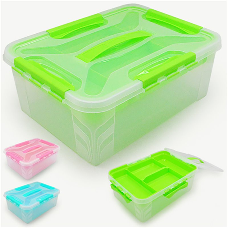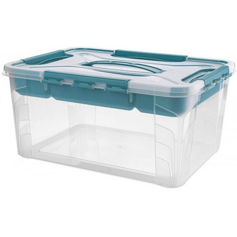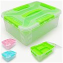 Емкость комплектуется крышкой с ручкой, которая плотно закрывается и дополнительно фиксируется ручками контейнера с четырех сторон, это препятствует случайному открытию крышки. Также бокс комплектуется вкладышем прямоугольной формы, который имеет четыре ячейки разного размера, в которых очень удобно хранить мелкие предметы. Прозрачные стенки судочка позволяют просматривать содержимое в нем. Контейнер универсальный имеет неограниченную сферу применения в быту и термин эксплуатации.