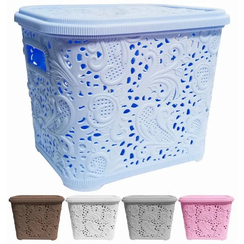 Кошик ажур 3,5л з кришкою призначений для зберігання предметів, дрібних речей, відмінно підійде для зберігання білизни, дитячих товарів, іграшок, косметики, канцелярського або швейного приладдя, та інших корисних дрібниць. Контейнер виготовлений з високоякісного кольорового пластику, безпечного для здоров'я.