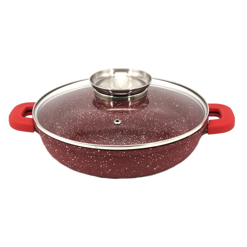 Сковорода казан виготовлений з високоякісного литого алюмінію, покритого спеціальним мармуровим антипригарним покриттям. Унікальна конструкція дна забезпечує рівномірне нагрівання по всій поверхні. Сковорода жароміцна може використовуватися на плитах будь-якого типу, а також у духовці. Казан має скляну кришку та силіконові ручки, які легко встановлюються.