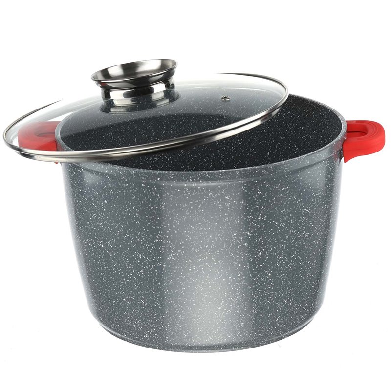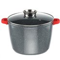 Каструля виготовлена з високоякісного литого алюмінію, покритого спеціальним мармуровим антипригарним покриттям, яке має високу теплопровідність. Унікальна конструкція дна забезпечує рівномірне нагрівання по всій поверхні. Жароміцна каструля може використовуватися на плитах будь-якого типу, в тому числі і індукційних, а також в духовках. До каструлі йде кришка з жароміцного скла з отвором для виходу пари та силіконові ручки, які легко встановлюються.