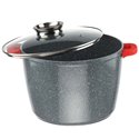 Каструля виготовлена з високоякісного литого алюмінію, покритого спеціальним мармуровим антипригарним покриттям, яке має високу теплопровідність. Унікальна конструкція дна забезпечує рівномірне нагрівання по всій поверхні. Жароміцна каструля може використовуватися на плитах будь-якого типу, в тому числі і індукційних, а також в духовках. До каструлі йде кришка з жароміцного скла з отвором для виходу пари та силіконові ручки, які легко встановлюються.