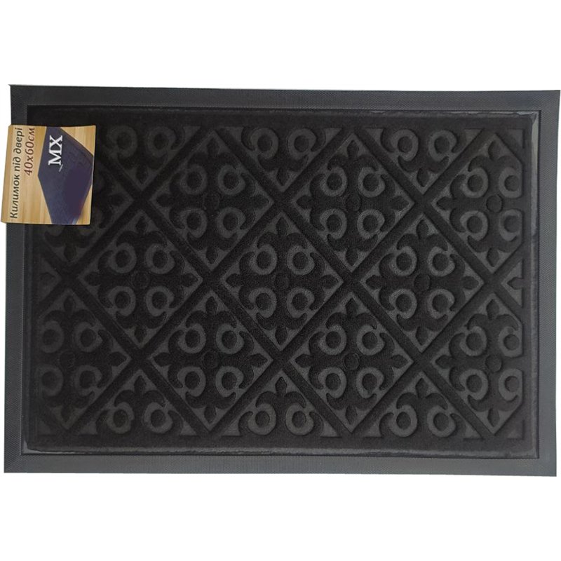 Килимок гумовий прямокутної форми з ворсовим покриттям добре збирає бруд і вбирає вологу, призначений для очищення взуття, використовується всередині і зовні приміщень. Гумовий килимок стійкий до температурних перепадів і не ковзає на вологій поверхні, виготовлений зі зносостійкої гуми.