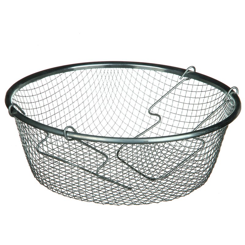 Кошик 18FB для смаження фритюрница виготовлений у вигляді сітки з нержавіючої сталі, що забезпечує безпечне і довговічне використання у фритюрницях, скороварках. Підходить для швидкого приготування продуктів на пару або в розжареній олії м'ясних, овочевих, рибних закусок, фрі і дозволяє практично відразу позбавитися від надлишків жиру. За допомогою двох складних ручок і невеликій вазі, кошик можна безпечно переміщати. Кошик для смаження легко миється в теплій воді за допомогою м'якої губки. Діаметр 18см.