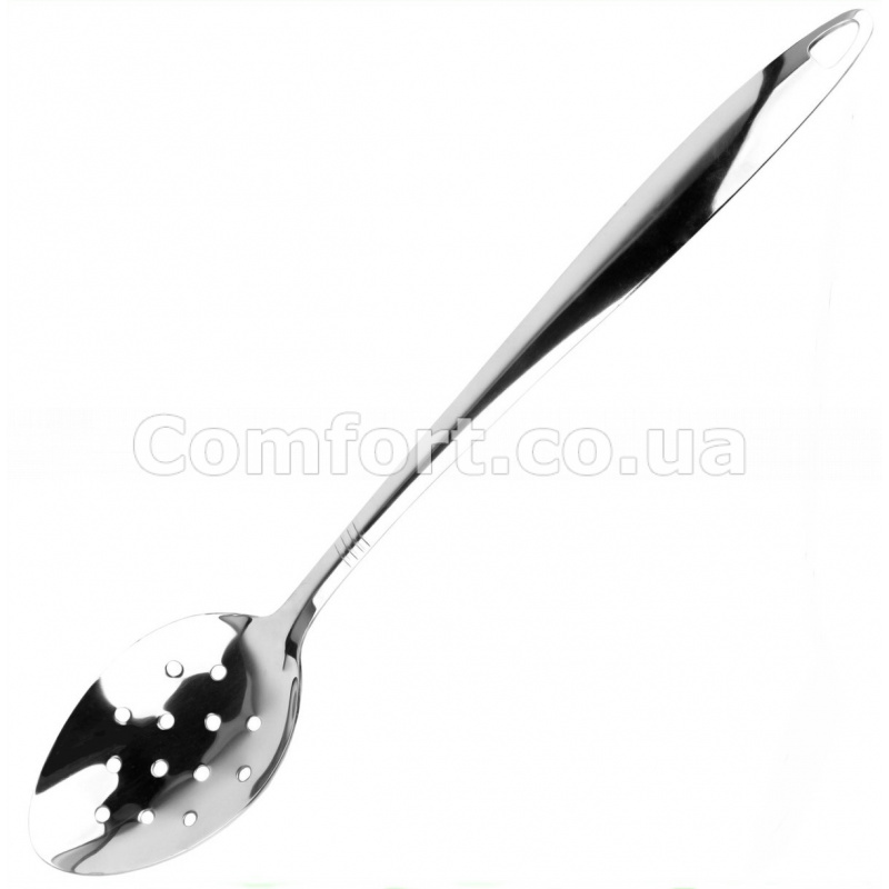 Ложка кухонна з дірочками виготовлена з високоякісної, харчової, нержавіючої сталі. Нержавіючі кухонні приладдя призначені для приготування страв на плиті. Зручна і практична гарнірна ложка з дірочками не вбирає запахи, жир і бруд, легко миється вручну або в посудомийній машині, має отвір для підвішування. Якісна гарнірна ложка з дірочками розроблена в лаконічному стильному дизайні, вона займе своє гідне місце серед інших аксесуарів на кожній кухні.