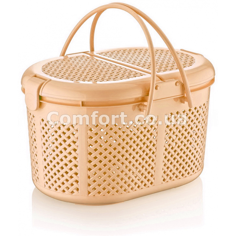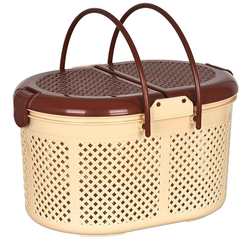 Кошик для пікніка SP-110 овальної форми, з двома кришками і довгими зручними ручками призначений для транспортування продуктів харчування та інших предметів необхідних на природі. Корзина має численні вентиляційні отвори, тому її зручно використовувати для перенесення спокійних домашніх тварин, які звикли до переїздів, кішок і невеликих собак, вага яких не перевищує 5кг.