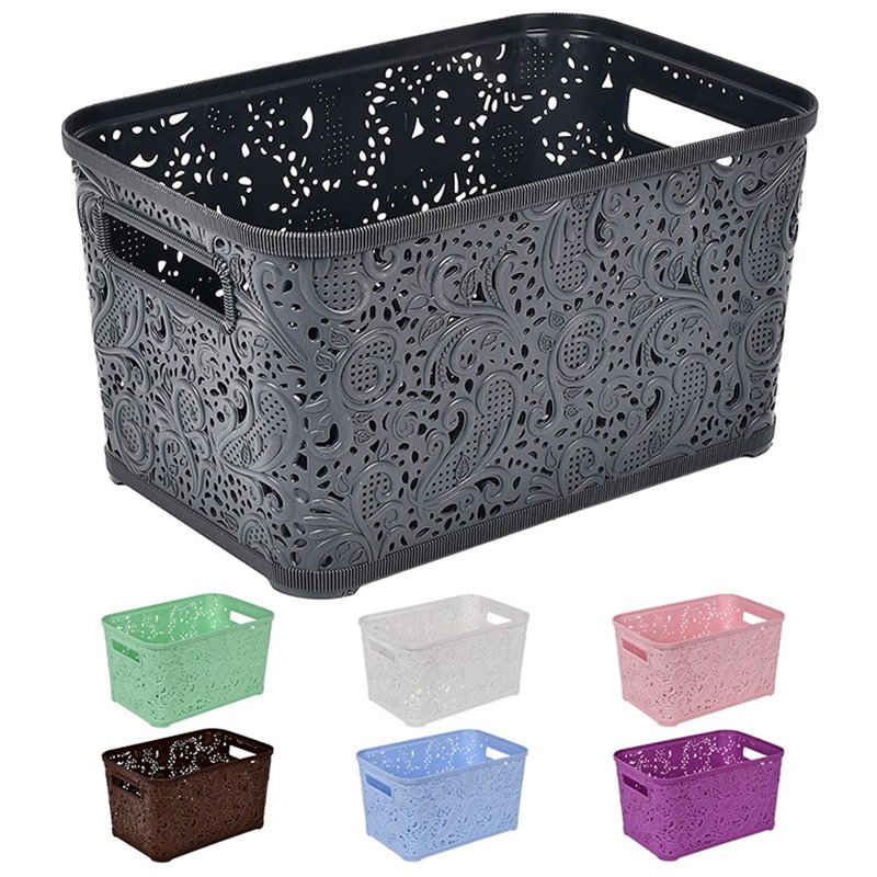 Кошик ажур 7,5л без кришки призначений для зберігання предметів, дрібних речей, чудово підійде для зберігання білизни, дитячих товарів, іграшок, косметики, канцелярського або швацького приладдя, і інших корисних дрібниць. Контейнер виготовлений з високоякісного кольорового пластика, безпечного для здоров'я. Конструкція органайзера для зберігання ажур без кришки є прямокутним контейнером, на бічних стінках є отвори для циркуляції повітря, з їх допомогою кошик зручно переносити. Дизайн кошику ажур для зберігання відрізняється яскравістю, оригінальністю має унікальний вид. Пластиковий кошик без кришки виконаний у вигляді ажурного візерунка. Органайзер для зберігання ажур без кришки має широкий асортимент кольорів. Корзина для зберігання ажур без кришки компактна, легка, міцна і містка, максимально підвищує рівень зручності, не вимагає особливого догляду. Кошик ажурний - стильний аксесуар для кожного будинку. Практична корзина ажур для зберігання потрібна в кожному будинку, вона не залишить Вас без уваги. Об'єм 7,5л. Розміри: 30х19,5х14см. Виробник: Україна.