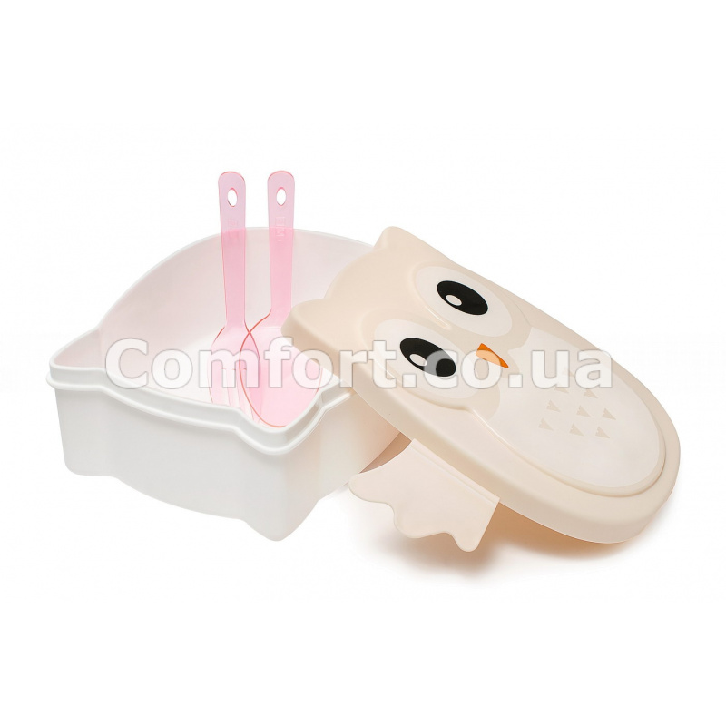 Ланч-бокс Сова 1л пластмасовий, фігурний з кліпсою виготовлений з високоякісного, харчового, кольорового пластику, який може контактувати з їжею, абсолютно безпечний для здоров'я, не містить шкідливих речовин, не змінює смаку продуктів і не має свого. Ланч-бокс кольоровий комплектується пластиковими столовими приладами. З таким контейнером можна не турбуватися про харчування поза домом, ланч-бокс забезпечить Вас смачним домашнім обідом. Ланч-бокс місткий та має компактні розміри, його можна носити в будь-якій сумці або рюкзаку. Цей стильний ланч-бокс стане оригінальним та корисним подарунком на будь-яке свято.