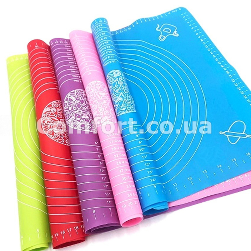 Килимок кухонний силіконовий виготовлений з безпечного харчового і термостійкого силікону, що забезпечує його довговічність і надійність у використанні. Силіконовий килимок підставка відмінно лягає на робочу поверхню і не ковзає при розкочуванні тесту. Поверхня не вимагає посипання борошном, оскільки тісто не прилипає до силіконового килимка. Нанесена геометрична розмітка по середині і по периметру килимка дозволяє працювати з тестом без додаткових вимірів.